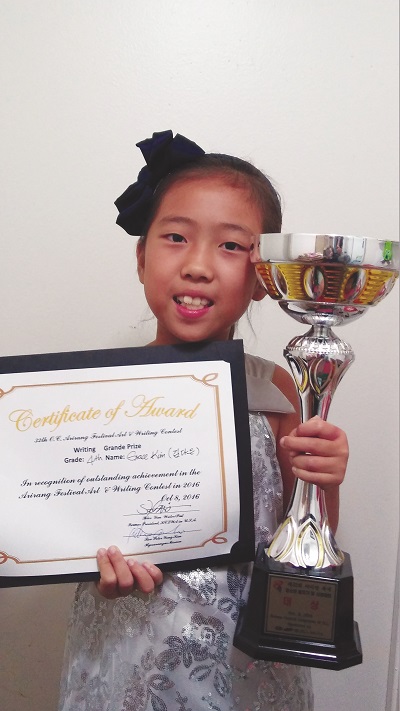 지난 10월 7일부터 9일까지 Buena Park에서 열린 오렌지카운티 아리랑 축제에서 효사랑선교회(김영찬 목사)가 주최하는 글짓기 그림 대회가 열렸다. 글짓기에서 장원을 차지한 김다은 양의 작품을 소개한다.
