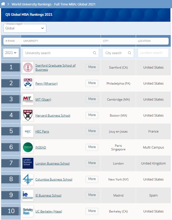 한편, 스탠퍼드 GSB가 QS 대학 순위 글로벌 정규 MBA 부문에서 여전히 1위를 기록했고, 와튼 스쿨은 2위에 머물렀다. HEC 파리, INSEAD, 런던 비즈니스 스쿨 및 IE 비즈니스 스쿨이 상위 10위권에 들면서, 오늘날 주요 MBA 프로그램의 국제적인 풋프린트를 부각시켰다.